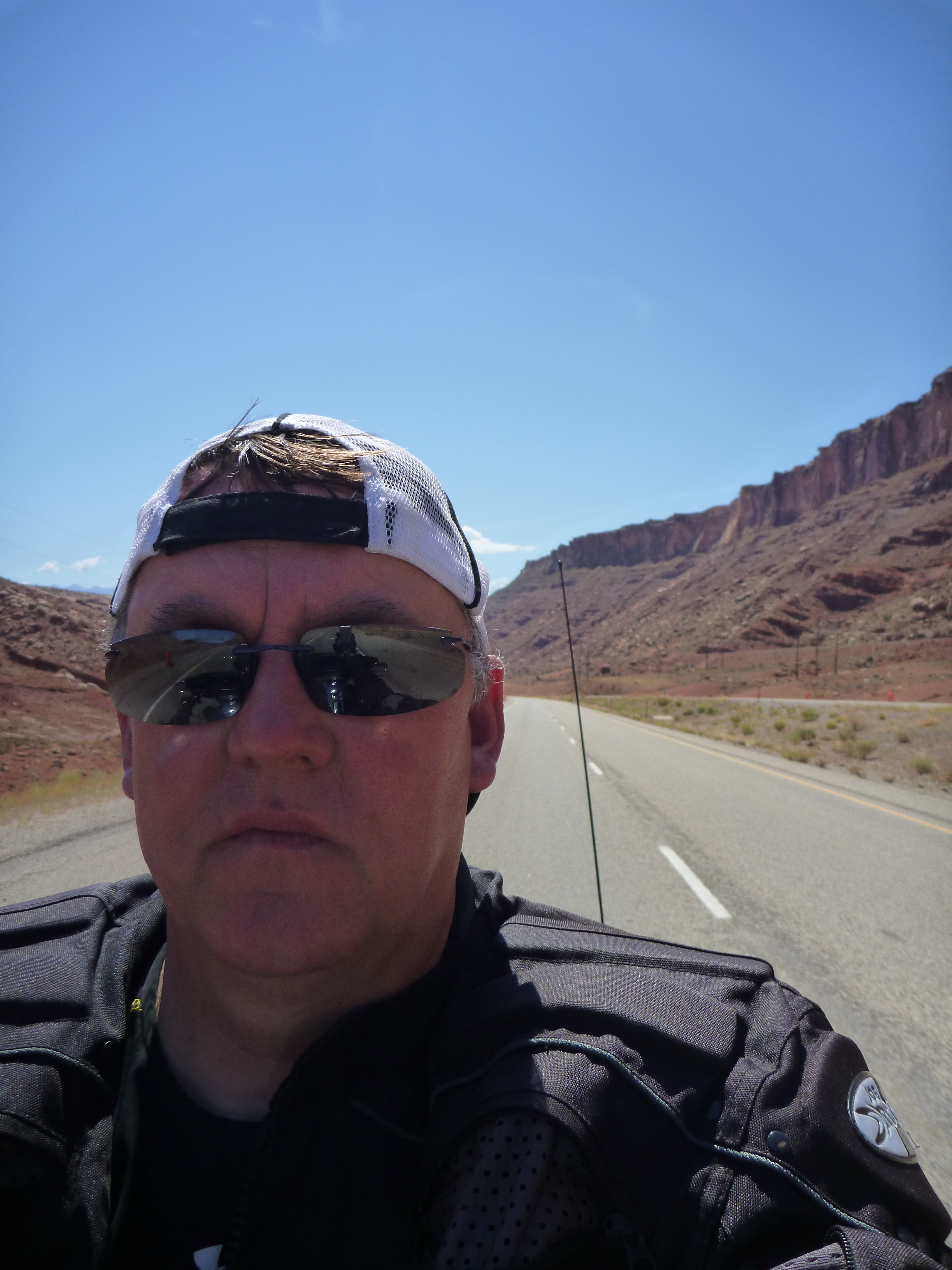 Today’s hat is the perfect Utah bikers hat. I discovered it while wandering around the Arches National Park. It provided great shade in the 100+F temps and was very adaptable to the bike. Cruising around the parks it provided great shade.