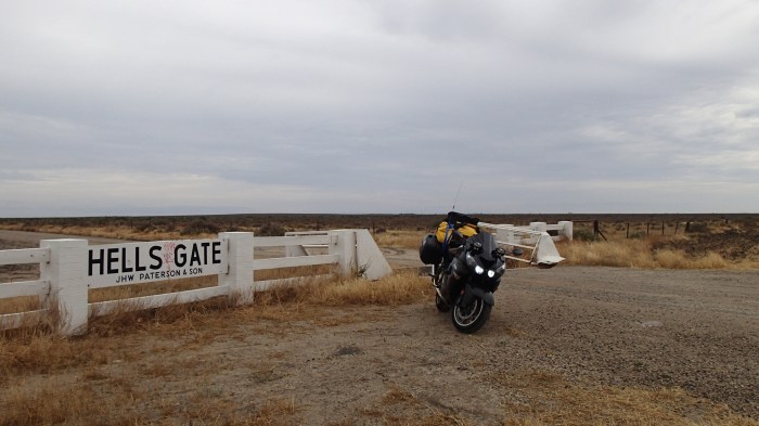 And before very long I was in the mist of a crazy storm cell with wind trying to force the bike off the road and with gusts that meant you couldn’t just lean into the wind. Along with the wind was the rain. This wasn’t falling it was being hurled at you sideways. I had to maintain a decent speed in order to maintain stability, too low and the bike was forced offline too easily. All the while I was trying to stay on the crown of the road to keep out of the deep puddles on the road which would rip my feet off the foot pegs.