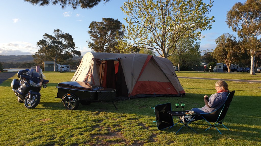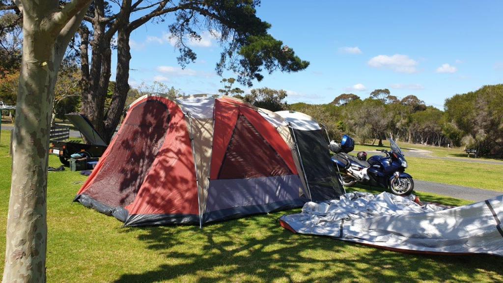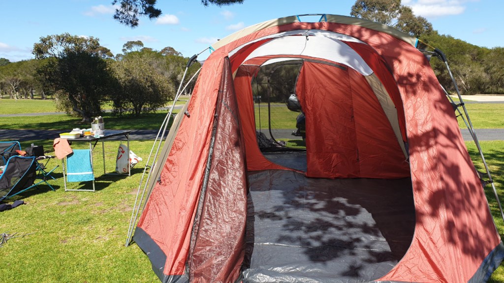 In the shed we have an older Oztrail 6 man dome tent, which is certainly bigger than we need, but packs up well. It did take a bit to set up but that was largely due to the fact that we hadn’t put it up for a few years and doing it high winds is always going to be a struggle. However, it did give us a good idea of things we’d want in a tent for traveling on the bike.