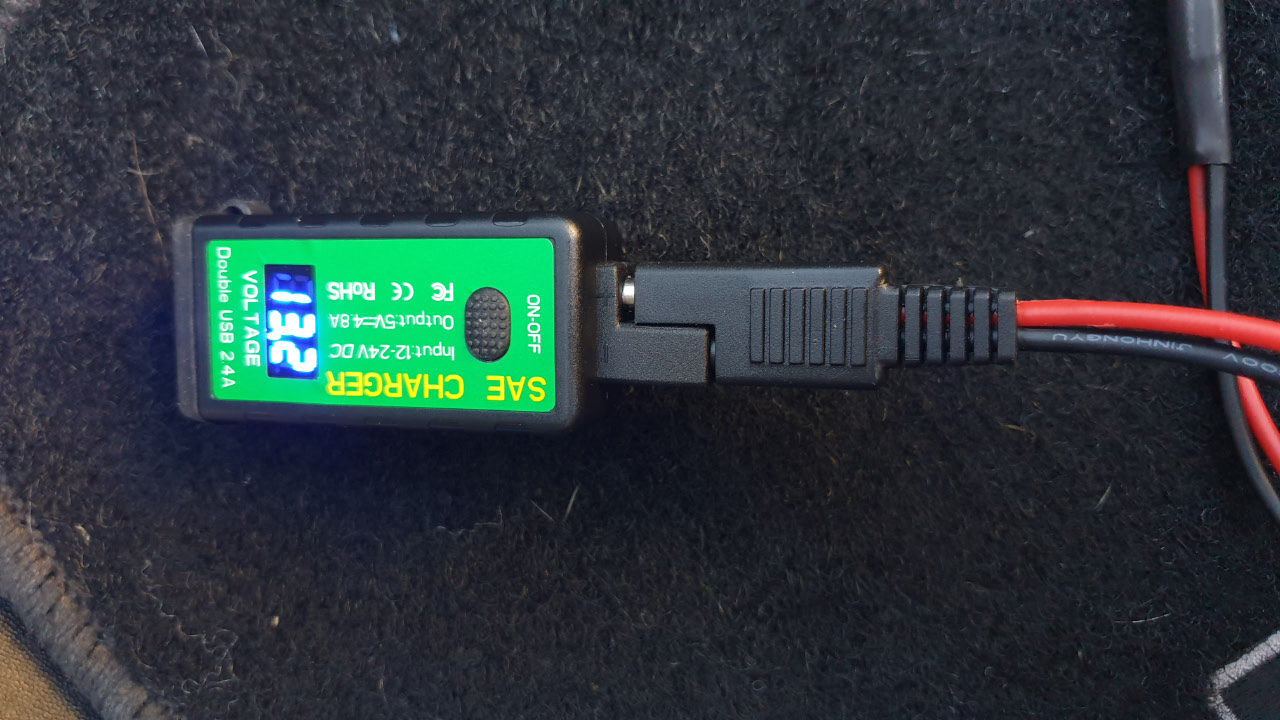 I could not find a good option for the trailer so I wired up the topbox using a SAE chassis plug and some adapters I can charge the power station, or USB devices. A big advantage of the small size of the Powertech is that it won’t take up much room in the top box when charging. And now that I have power in the top box it wouldn’t be hard to add a light inside the top box for those dark nights when you are trying to find something.