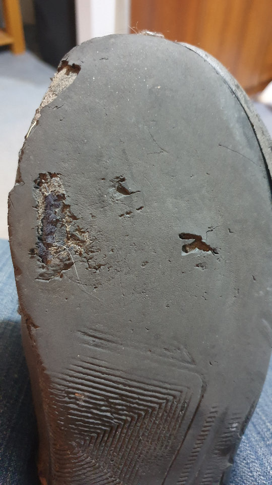 After 3 years of regular use and many miles they are ready to be retired as I have worn the sole down to the canvas on left boot. Why only the left boot.? The bike’s side stand is on the left so you always get on and off the bike from the left, where you swivel on your left foot as part of the action of mounting and dismounting.