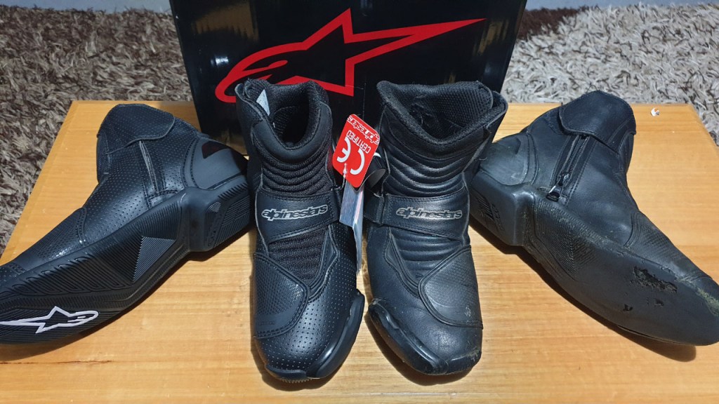 In preparation for our 2018 two week tour in the US we each bought a pair of Alpinestars short ankle length boots (his-SMX-1R, and hers-Stella SMX-1R). Below is a picture comparing the size of my short and full size motorcycle boots.