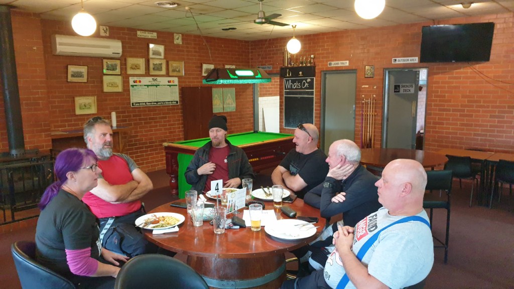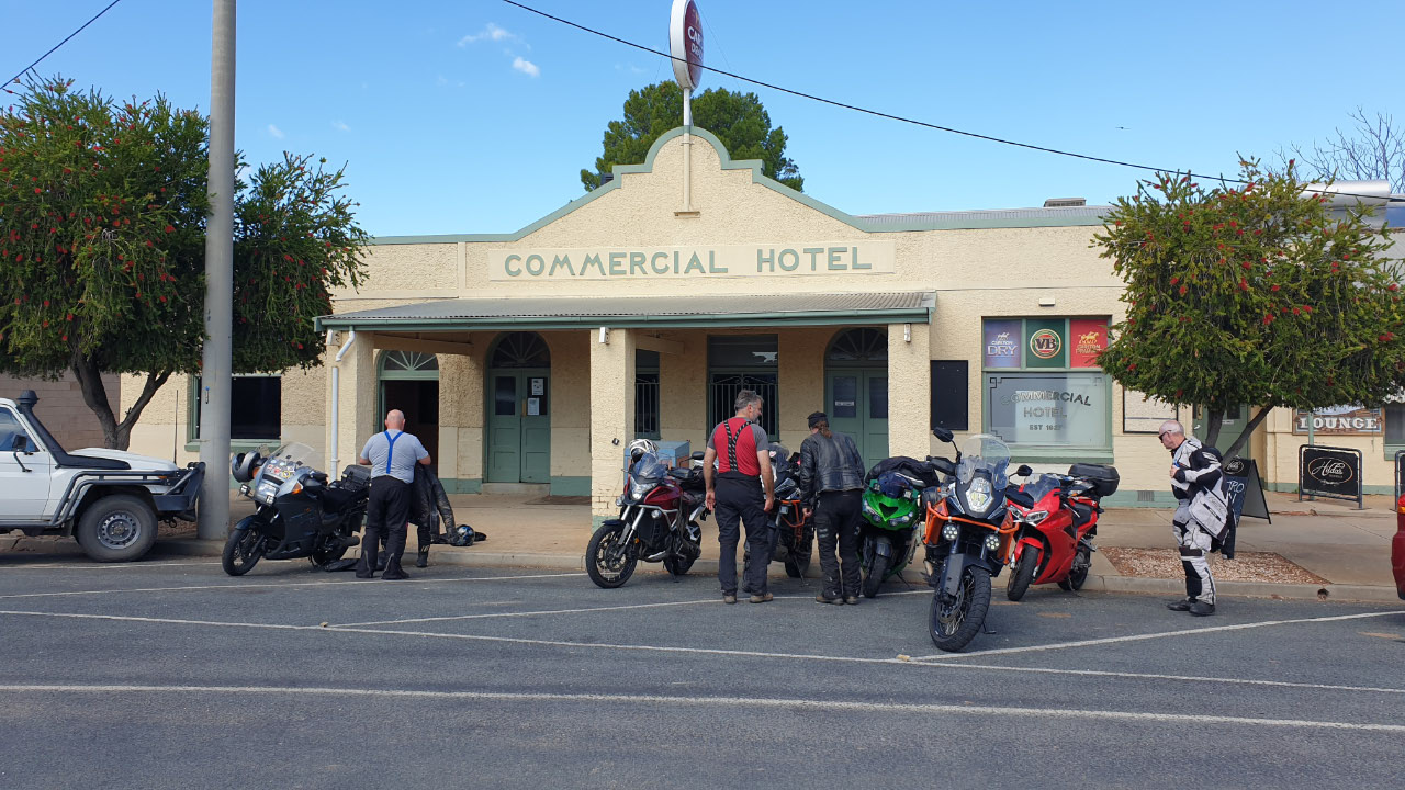 As we rolled into Lake Boga the familiar red VFR800, with cool stumpy IXIL pipes hanging out the side, parked out the front of the pub and before long Ron wandered out to meet us. Then within about 15 minutes we were joined by the Melbourne crew. It’s always great to catch up with this crew and hang out.