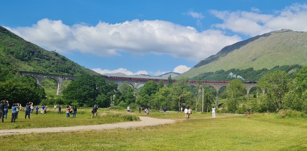 For those Harry Potter fans, this is the train, and this is the bridge crossing from the movie. Okay, I didn’t need to tell you that because you already know. And from the number of people who came out to view the train at the Glenfinnan viaduct this is clearly a very popular activityfor tourists/stream train enthusiasts/Harry Potter fans. And there are four crossings per day … so a lot of people come to see the train.
