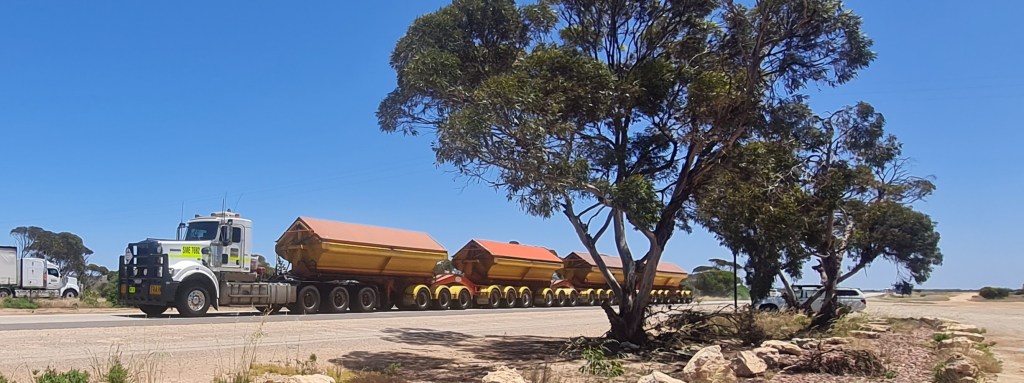 And about those big trucks. Check this out.! I have no idea what he’s carting, but that’s four trailers, six axles per trailer, with 3 driving axles, and steering wheels on the prime mover … that’s a total of 98 wheels.! I’d hate to be paying that tyre bill.!